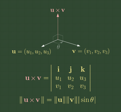 두 3차원 벡터의 외적(=벡터곱)을 구하는 공식이다. u, v 두 벡터의 외적u × v는 벡터의 좌표를 이용하여 구하거나, u, v, u × v가 오른손계가 되고 길이가 u, v가 이루는 평행사변형의 넓이와 같도록 구하면 된다.