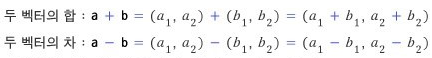 좌표평면 위의 두 점 A(a1, a2), B(b1, b2)에 대하여 두 점의 위치벡터를 각각 a, b라고 하면 a = (a1, a2), b = (b1, b2)이므로 두 벡터의 합, 차, 스칼라 배는 각각 다음과 같이 대응되는 성분끼리 연산을 하면 된다.
