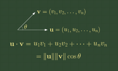 벡터의 내적을 구하는 공식이다. n차원 벡터의 경우 벡터의 좌표나 벡터의 길이와 사잇각을 이용하여 구할 수 있다.