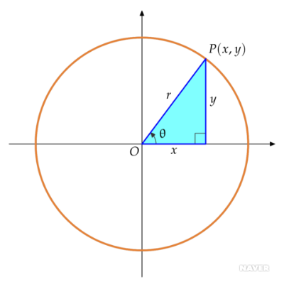 이 원 위의 점 P(x, y)에 대해 동경OP가 x축과 이루는 각을 Θ라고 하면