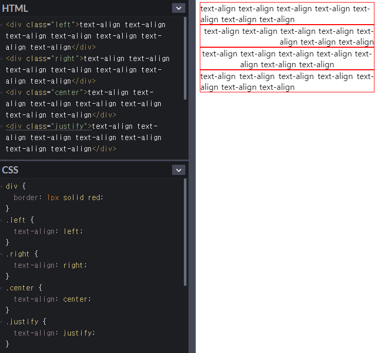 justify : 양쪽 맞춤. 2줄 이상일때.