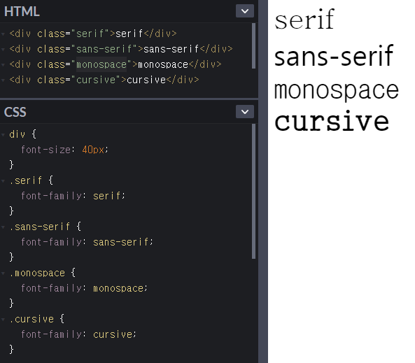 글꼴 계열 : serif, sans-serif, monospace, cursive, fantasy.
