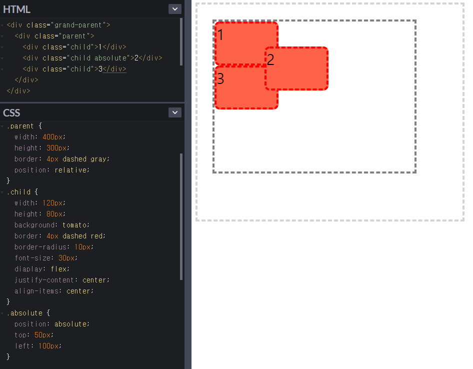 absolute : 위치 상 부모 요소를 기준으로 배치.