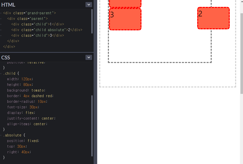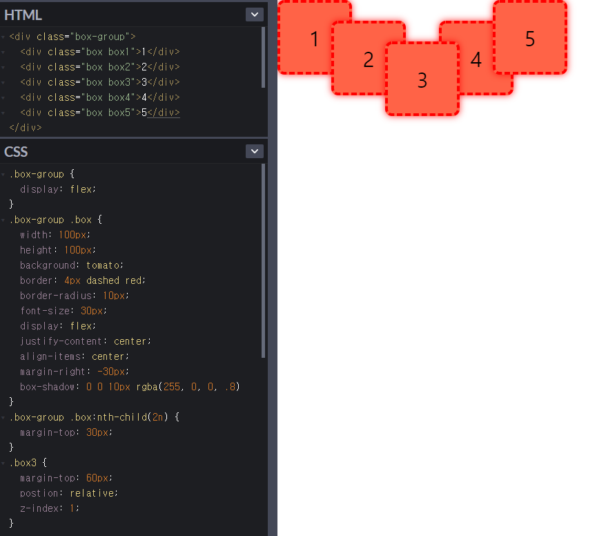 3. position 속성의 값이 있고 z-index 속성의 숫자 값이 같다면 'HTML'의 마지막 코드일 수록 위에 쌓임.