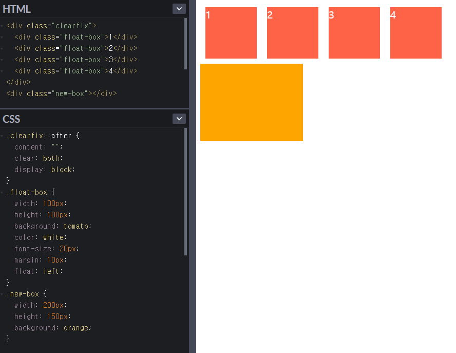 3. float 속성이 추가된 요소의 부모요소에 미리 지정된 clearfix 클래스 추가.(추천!!!!)