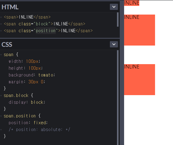 ; absolute, fixed 속성 값이 적용된 요소는 display 속성의 값이 대부분 block 으로 수점됨.