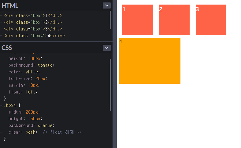 1. float 속성의 형제 요소에 clear: (left, right, both) 추가하여 해제.