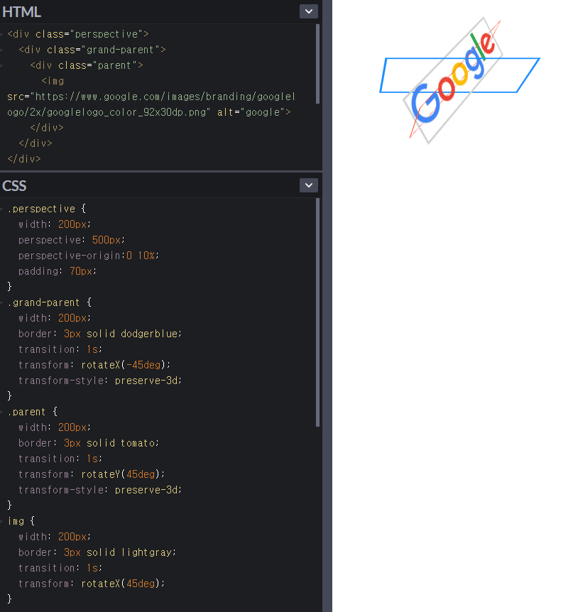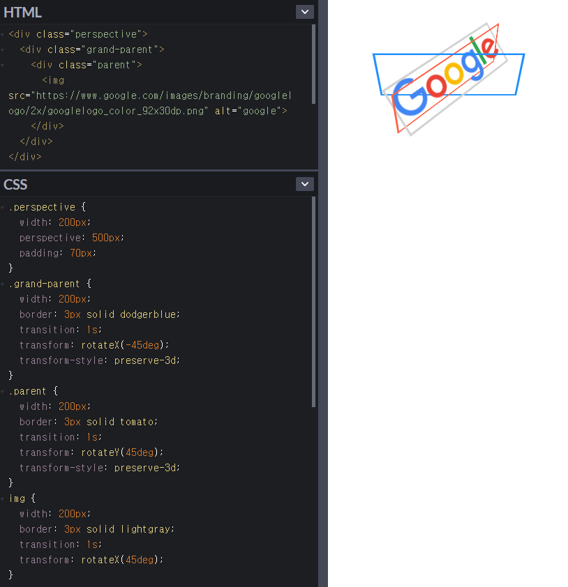 perspective(속성으로 사용할때) : 적용 대상은 관찰 대상의 부모요소. perspective-origin.