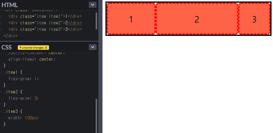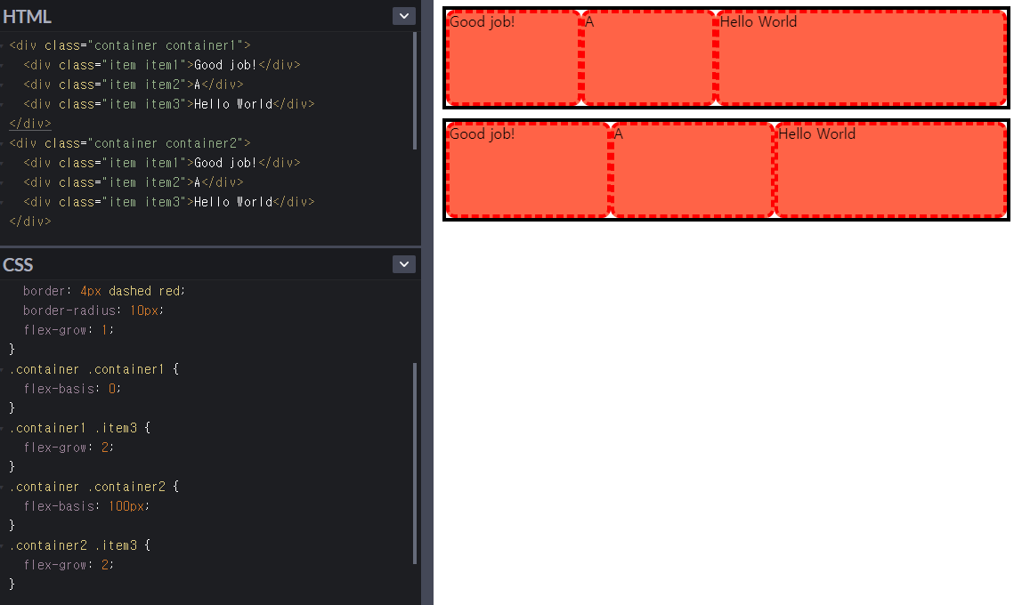 flex-basis: 0; 이 아닌 flex-basis: 100px; 값이 주어질 경우 값을 제외한 나머지 공간을 배분.