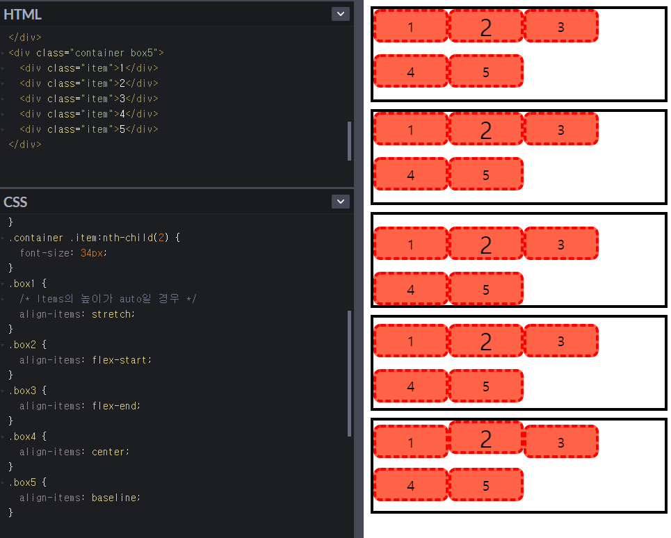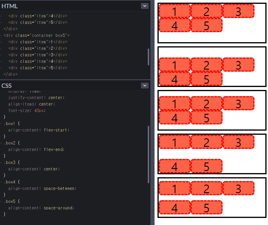 ; 교차 축(cross-axis)의 정렬 방법을 설정. *flex-wrap 속성을 통해 Items가 여러 줄이고 여백이 있을 경우만 사용 가능.