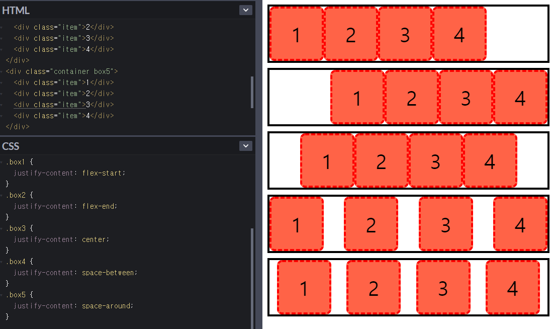 space-around : Items를 균등한 여백을 포함하여 정렬.