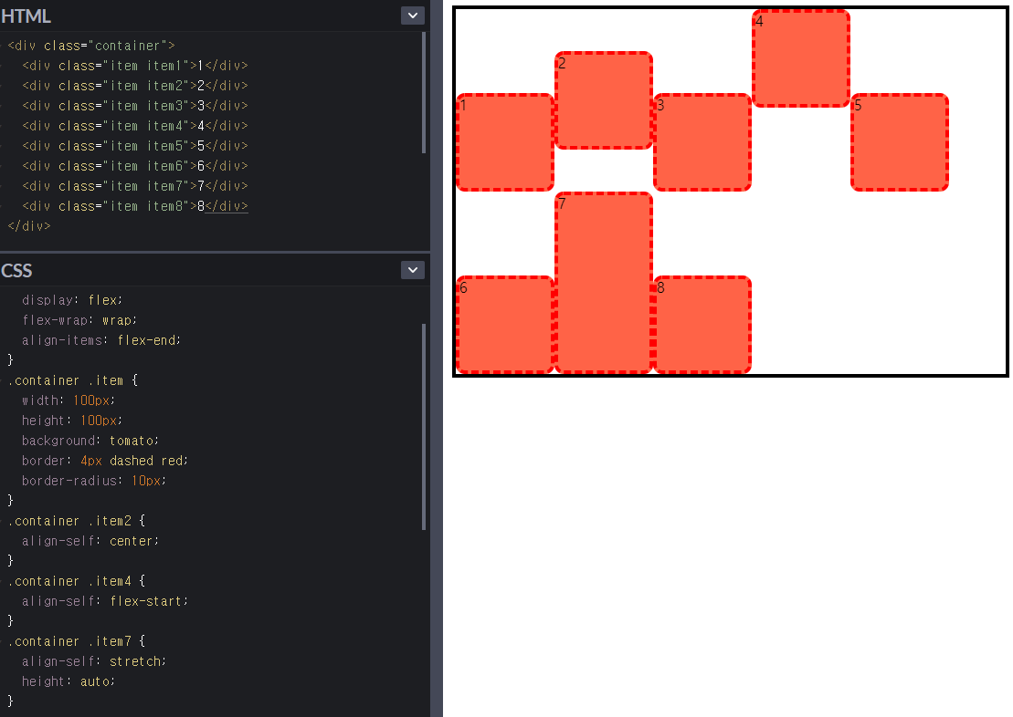 ; 교차 축(cross-axis)에서 개별 Item의 정렬 방법을 설정. 필요에 의해 일부 Item만 정렬 방법을 변경하려고 할 경우 사용.