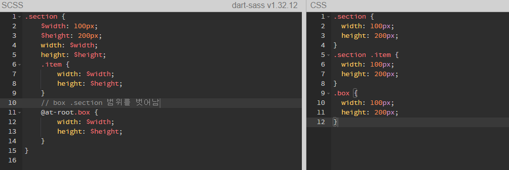 중첩에서 벗어나고 싶을 때 @at-root 키워드를 사용.