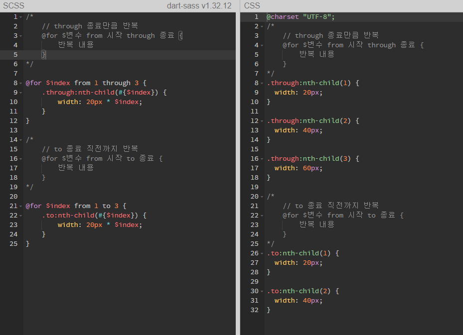 @for 는 @through 를 사용하는 형식과 to 를 사용하는 형식으로 나뉨.